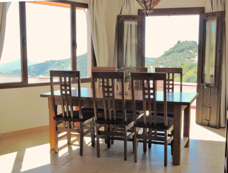 Vanuit de keuken kom je in het leefgedeelte met airconditioning, open haard, zithoek en eetplaats. De eetplaats met verlengbare tafel is halfrond met veel ramen die je een mooi uitzicht bieden op de vallei.